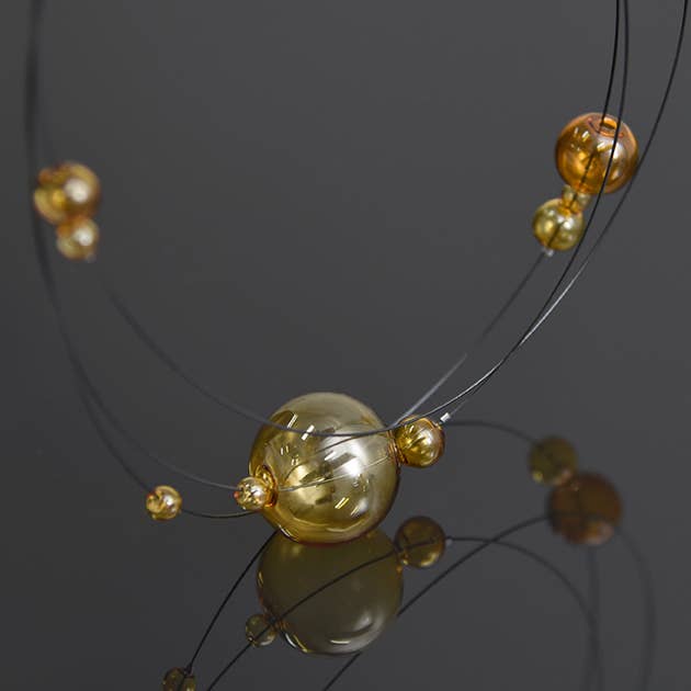 A stunning necklace with a floating-like layered design made up of three strands of carefully spaced glass orbs of assorted sizes. This piece is a dramatic ready-to-wear statement and features a magnetic clasp for easy on-and-off! Material *Orbs are Tinted Glass *(Please note: these glass beads are sturdy and are not easily broken) Wire is 49-strand flexible bead stringing wire Clasps are magnetic for easy clip-on Dimensions The shortest strand measures 15 3/4" and the longest measures 17" Assorted glass orbs from 1/4", 3/8", 1/2", 1-1/8" Diameter. MADE IN CANADA.