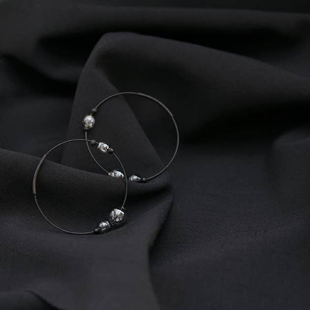 Fun and fabulous! Made in Canada. The wire of these hoops opens from the tube piece and easily fits through the ear, making this airy pair of hoops the perfect lightweight accessory. The teeny glass beads are lightweight and immediately eye-catching! Materials All metals are brass finished with plating. *Orbs are Tinted Glass (Please note: these glass beads are sturdy and are not easily broken) Finishing 12K Gold, Rhodium, *Black Zinc on brass (*Nickel Free) Dimensions Each hoop measures 1.5" Dia. the largest bead is 0.5" Dia.