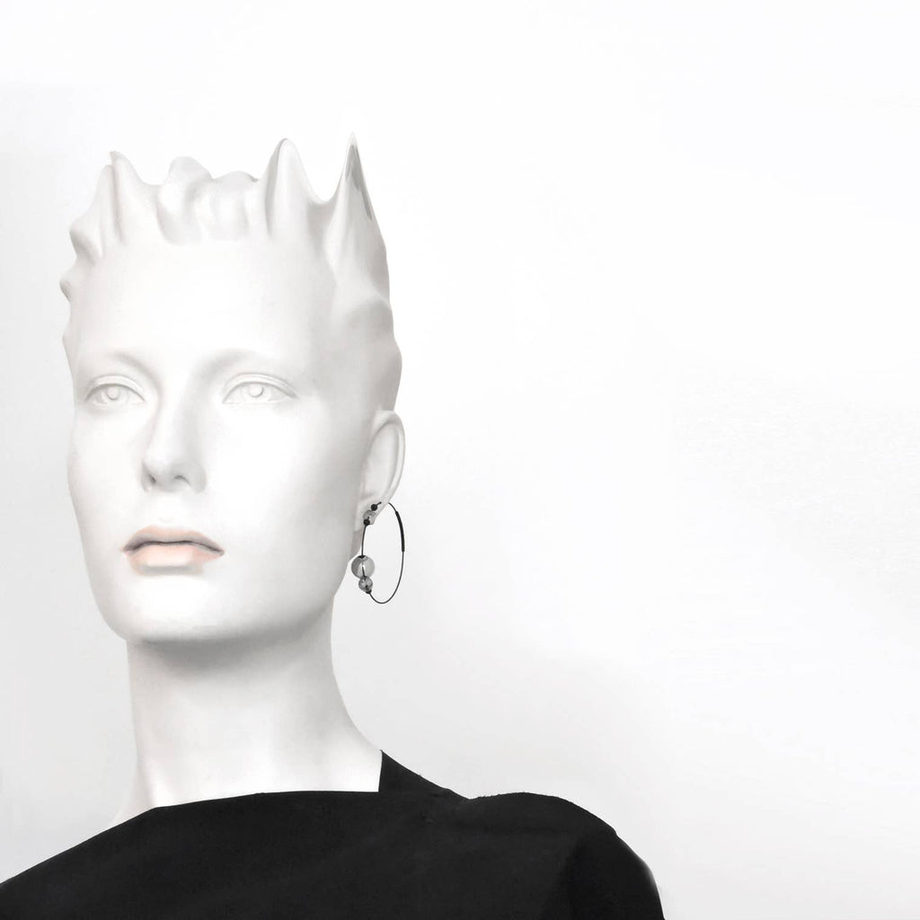 Fun and fabulous! Made in Canada. The wire of these hoops opens from the tube piece and easily fits through the ear, making this airy pair of hoops the perfect lightweight accessory. The teeny glass beads are lightweight and immediately eye-catching! Materials All metals are brass finished with plating. *Orbs are Tinted Glass (Please note: these glass beads are sturdy and are not easily broken) Finishing 12K Gold, Rhodium, *Black Zinc on brass (*Nickel Free) Dimensions Each hoop measures 1.5" Dia. the largest bead is 0.5" Dia.