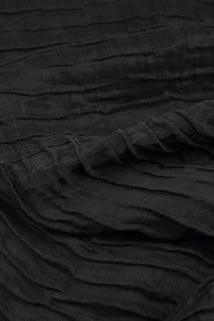Crafted from breathable crinkled silk linen, these black trousers feature gentle ruching along the hem for subtle texture. Their relaxed silhouette ensures comfortable wear, while the sculpted shape lends a refined touch to everyday outfits. Expertly designed and made in Europe, they offer an elegant yet effortless addition to your wardrobe.