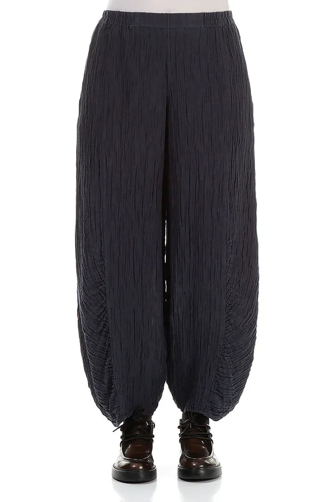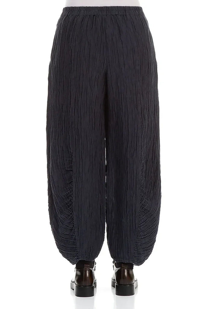 Crafted from breathable crinkled silk linen, these black trousers feature gentle ruching along the hem for subtle texture. Their relaxed silhouette ensures comfortable wear, while the sculpted shape lends a refined touch to everyday outfits. Expertly designed and made in Europe, they offer an elegant yet effortless addition to your wardrobe.