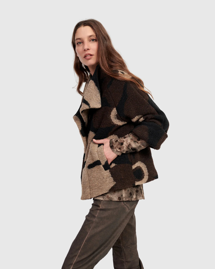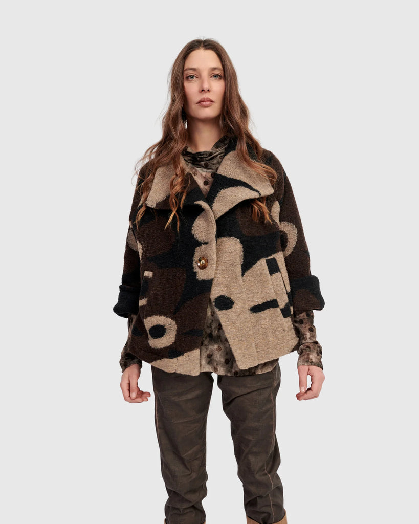 The Floral Cozy Jacket is a stylish cropped layering piece designed for cooler days. Its boxy A-line silhouette and oversized lapels create a bold, structured look, while the brushed knit fabric ensures a soft yet shape-retaining drape. The cropped length pairs effortlessly over tunics or dresses, and the subtle floral pattern adds a refined touch of playfulness to this expertly crafted jacket.