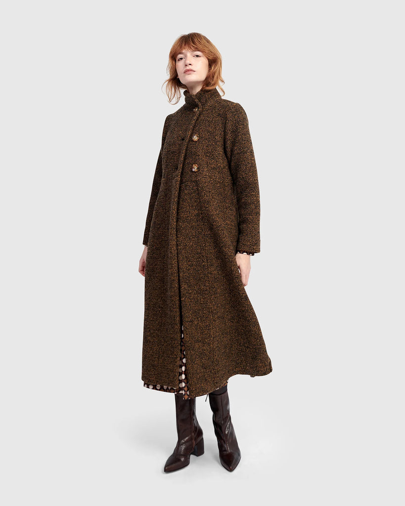 The HONEY Long Coat combines refined craftsmanship with its timeless tailored design and comfortable fit. Its gently flared silhouette complements diverse body shapes, while the foldable high collar and mid-calf length provide practical warmth and coverage. Made from a premium wool blend knit with a soft brushed finish, this coat ensures both durability and a luxurious feel, making it an adaptable piece for any wardrobe transition from day to evening occasions.