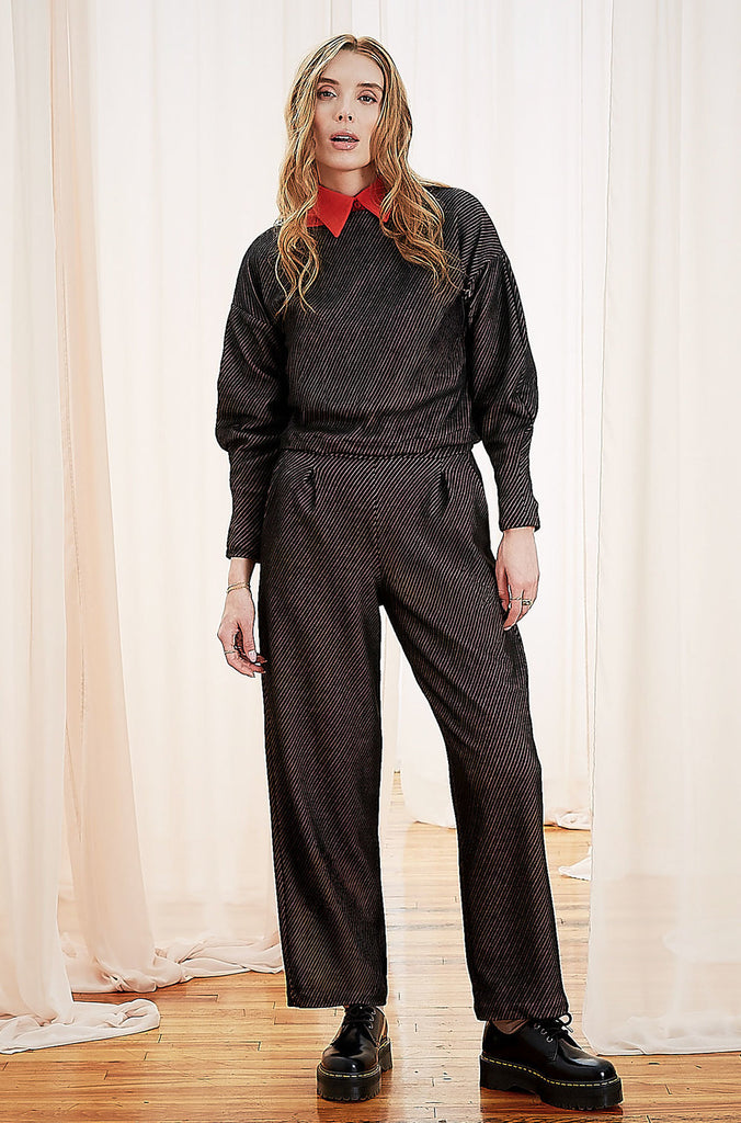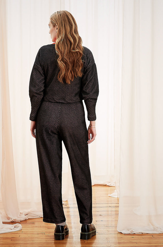 The LEWIS top offers a soft, cozy fit paired with a flattering silhouette, perfect for styling with the matching Lucas pants, denim, or your preferred bottoms. Featuring a chic boat neck and elegant long puffed sleeves that taper at the wrists, this crop top balances comfort with sophistication. Expertly crafted in Montreal, it reflects refined design and quality, making it a versatile staple for any wardrobe.