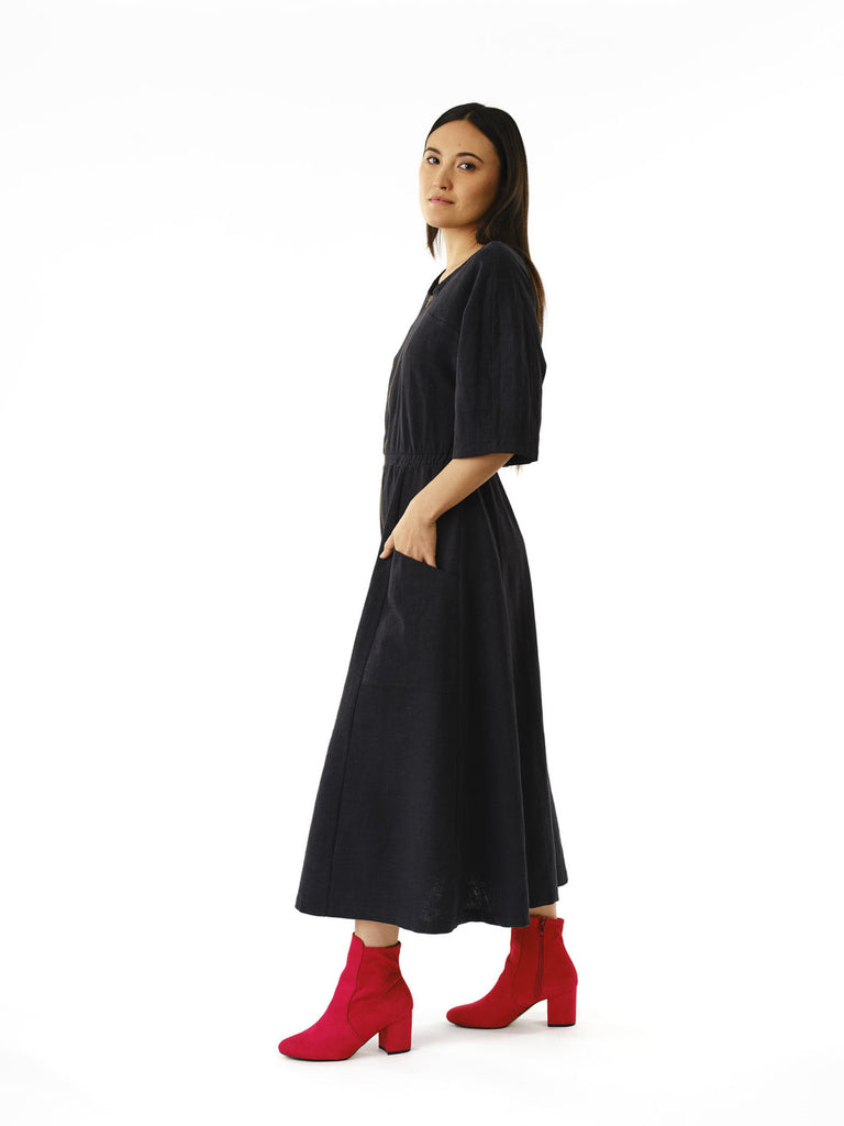 The Omega Dress combines comfort and style effortlessly. Featuring an elasticized waist and a 22” front brass zipper, it offers easy wearability and a tailored fit. Its ¾ length batwing sleeves with geometric detailing enhance the sophisticated silhouette. Crafted from ultra-soft ramie fabric, it falls elegantly below the knee. Deep patch pockets provide practical storage, making this dress a versatile and refined addition to your wardrobe.