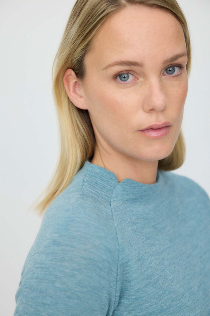 This Merino Wool Top 4063 in Arctic Melange combines softness with a fitted silhouette highlighted by a flattering neckline and saddle back design. Featuring dropped shoulders, a raw edge hem, and thumb holes for added warmth, it offers enhanced comfort in cooler weather. Crafted in Europe, this cozy and stylish piece is an essential layer for a refined, warm wardrobe.