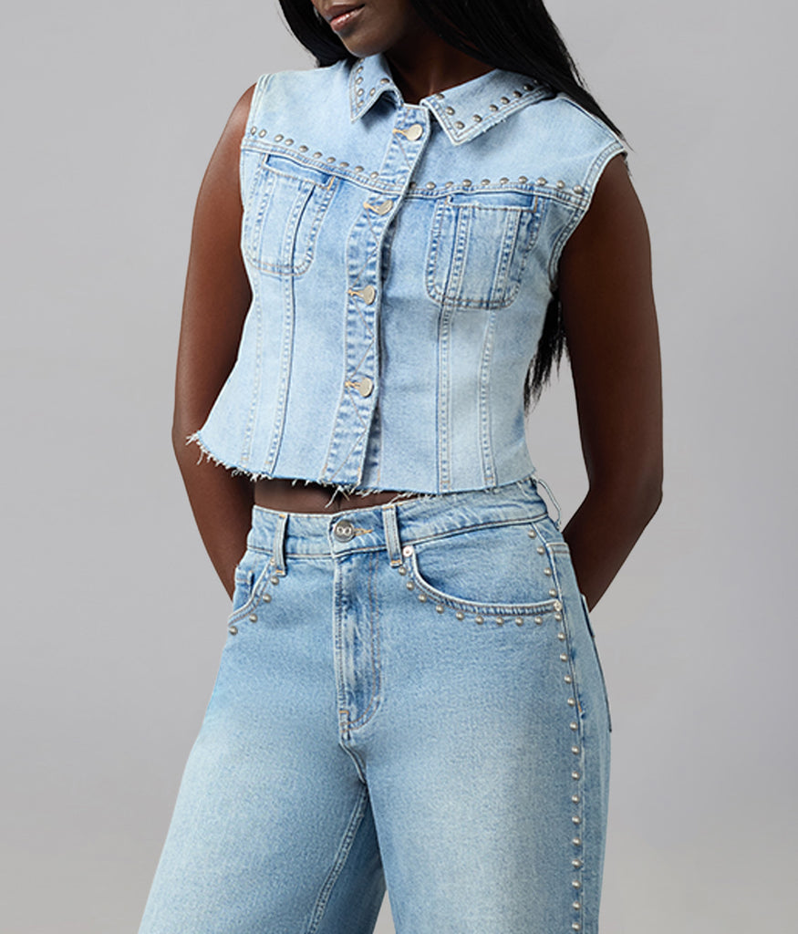 The GABBIE Denim Vest in Studded Whimsy Blue is a modern take on a classic, blending structured tailoring with a playful, studded finish.