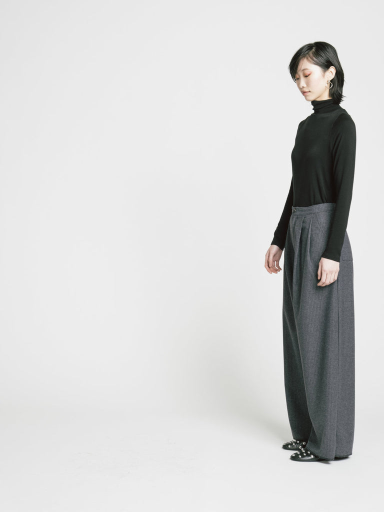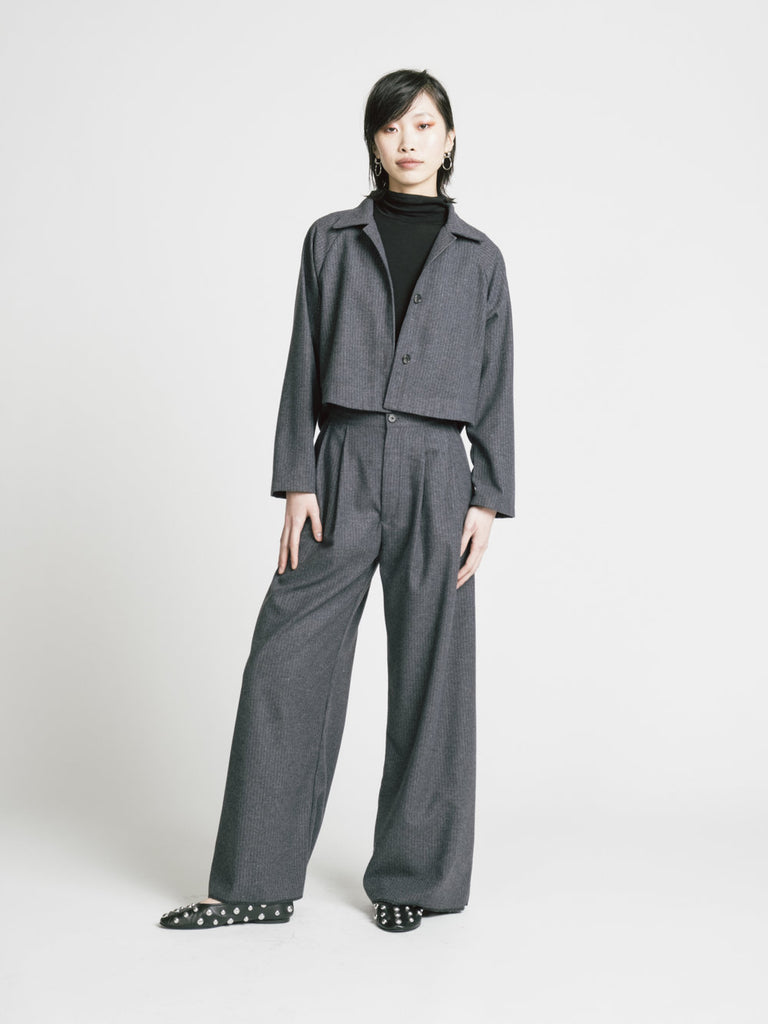 These wide-leg pants deliver timeless sophistication with a subtle pinstripe pattern. The fly-front design features crisp pleats that enhance the silhouette, while functional front pockets and back patch pockets provide practical storage. Pair effortlessly with the matching Cycle jacket for a polished work ensemble. You can also style it with blouses, turtlenecks, sweaters, and tees - just a perfectly versatile piece for fall and winter. Please note: this style runs small—we recommend sizing up for optimal comfort and fit. Designed and made in Canada.